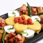 chifteluţe de porc, frigărui de pui în bacon, inele de ceapă, bulete de brânză şi caşcaval, gujoane de pui, ciuperci umplute cu bacon şi caşcaval, frigărui adana kebap, sos de usturoi, sos sweet-chilli
