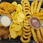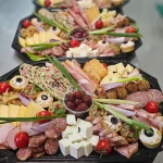 prosciutto crudo, salami, ghiudem, cârnaţi uscaţi de casă, muşchiuleţ de porc, caşcaval afumat de casă, brânză de Burduf, brânză Camembert, doboş, măsline mixte cu busuioc şi usturoi, mini Caprese, tartine cu salată de vinete şi maioneză, tartine cu salată de icre crap, crakers, fructe